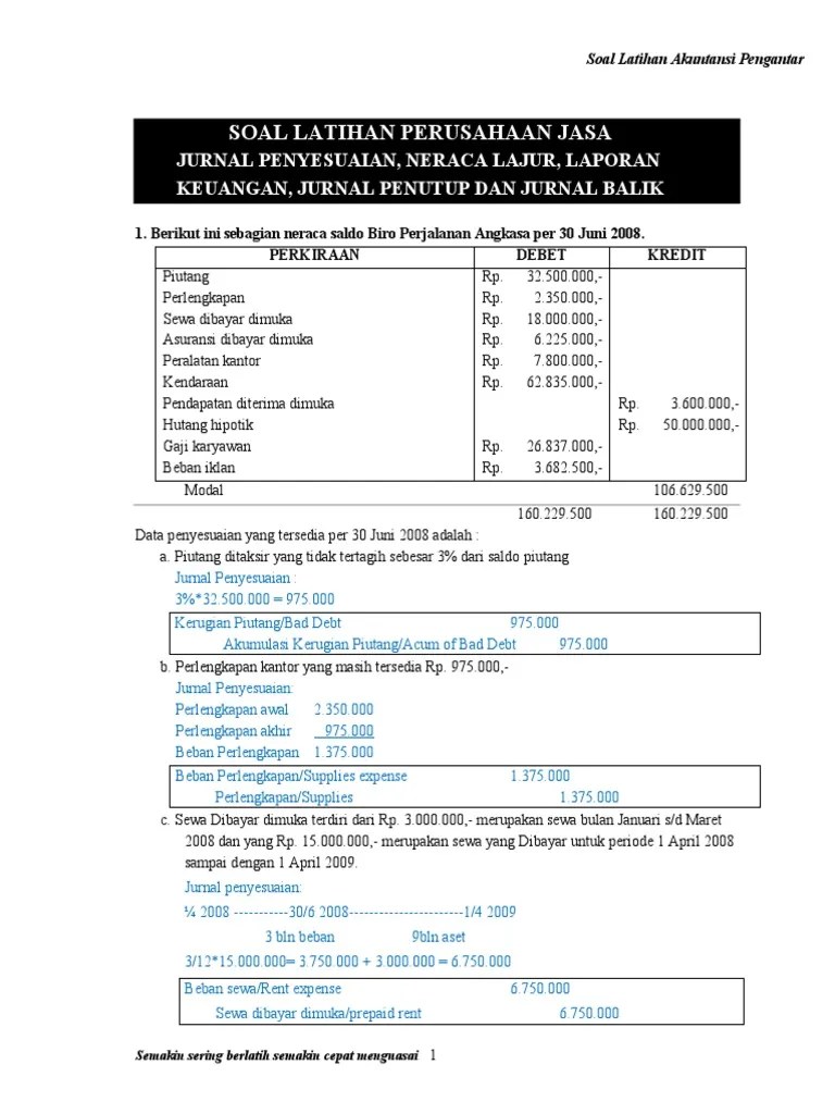 Apr 29, 2020 · contoh soal jurnal penyelesaian transaksi perusahaan dagang untuk perusahaan dagang perlu dilakukan penyesuaian atas persediaan barang dagangkarena data persediaan barang dagang yang dilaporkan pada neraca saldo akhir periode sudah tidak relevan sehingga harus diperbaharui dengan nilai persediaan barang dagang yang tepat. Mar 19, 2021 · contoh soal ayat jurnal penyesuaian dan jawabannya. Nilai saldo akun perlengkapan dalam neraca saldo berjumlah rp. Pasalnya apabila sebuah perusahaan tidak menggunakan jurnal penyesuaian dalam pembukuan. Apabila pada akhir suatu periode, diketahui kalau terdapat beban yang harus dibayar maka transaksi tersebut wajib dicatat dalam jurnal penyesuaian (adjustment jurnal).