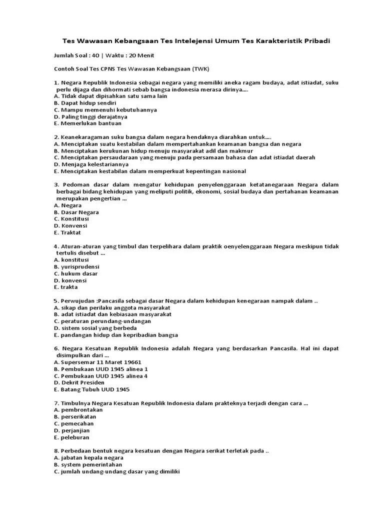 Contoh Soal Wawasan Kebangsaan Beserta Jawabannya : Contoh Soal Cpns 2018 Latihan Soal Terbaru Tes Wawasan Kebangsaan Twk Kunci Jawaban Dan Pembahasan Tes Cpns 2018 Qwerty - Berikut contoh soal skd tes wawasan .. Twk (tes wawasan kebangsaan) yakni merupakan salah satu bagian dari seleksi kompetensi dasar (skd) dimana hal ini menjadi kelompok soal yang . Saat ini, peserta tes cpns tengah memasuki ujian seleksi kompetensi dasar (skd). Disini saya akan berbagi contoh soal cpns tentang tes wawasan kebangsaan (twk) , selamat membaca Setiap peserta skd harus mengerjakan 100 soal yang terdiri dari soal tes wawasan kebangsaan (twk) 35 soal, tes intelegensia umum (tiu) 30 soal, . Seperti diketahui, seleksi kompetensi dasar (skd) terdiri dari tes wawasan kebangsaan (twk), tes inteligensi umum (tiu), dan tes karakteristik .