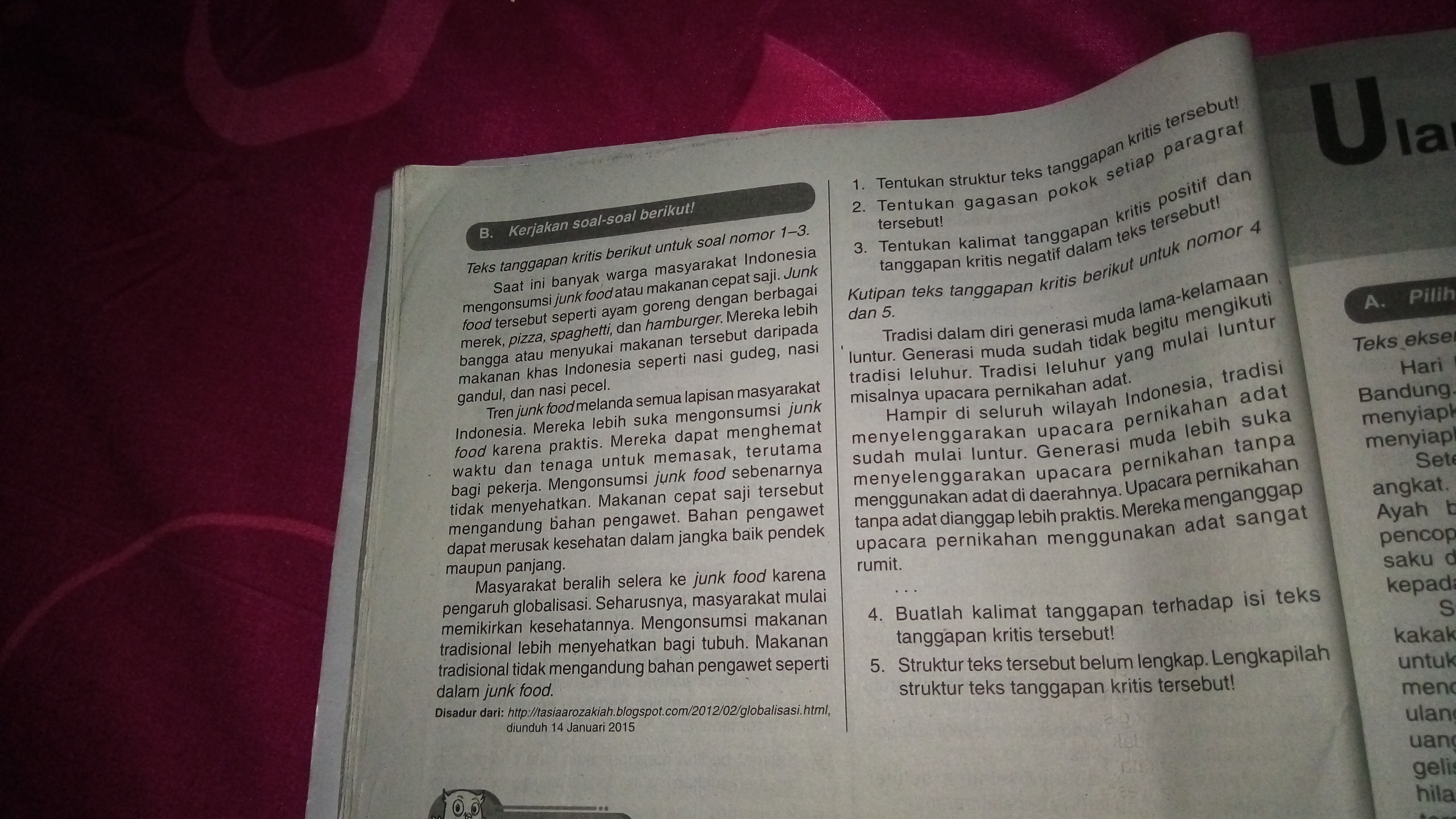 Teks tanggapan kritis adalah teks yang berisi kritik pedas . Contoh teks tanggapan kritis beserta strukturnya. Ilustrasi contoh teks tanggapan kritis singkat beserta strukturnya. Contoh teks tanggapan kritis kelas 9 tentang sampah, lingkungan sekolah, dan tentang novel. Menggunakan kalimat yang memiliki lebih dari dua struktur dan dua verba. Kaidah kebahasaan teks tanggapan kritis · 1. Hukuman mati bagi pengedar barang haram. Teks ini berisi jawaban mengenai adanya fenomena yang muncul, disertai sebuah alasan dan fakta. Struktur teks tanggapan kritis terdiri dari evaluasi, deskripsi dan penegasan ulang. Contoh teks debat beserta strukturnya. Contoh teks tanggapan kritis yang singkat, padat, dan jelas tentang pendidikan. Contoh teks tanggapan kritis singkat beserta strukturnya. Kebakaran hutan dan kebun sawit.